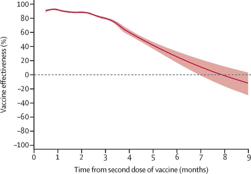 2回接種から時間が経過すると有効性は下がったが、3回目の追加接種で上昇することが確かめられた。