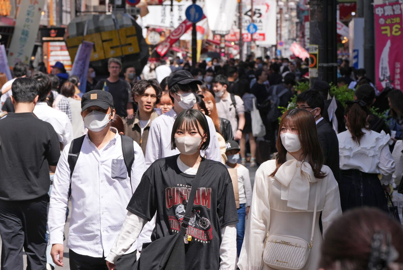 5類移行まで1週間を切った2日、大阪市内の繁華街を行き交う人の大多数がマスクを着用していた。電車内でもマスクをしていないのは主に外国人観光客で、多くは会話も控えているようだ。
