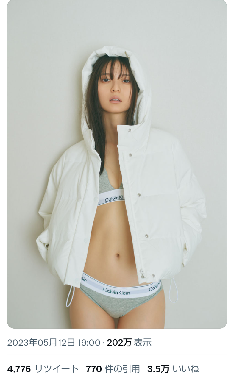 今回公開されたカットは、下着姿のまま真っ白なダウンをはおった鮮烈ショット。