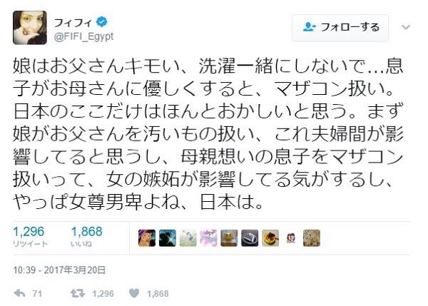 〈娘はお父さんキモい、洗濯一緒にしないで…息子がお母さんに優しくすると、マザコン扱い。日本のここだけはほんとおかしいと思う。まず娘がお父さんを汚いもの扱い、これ夫婦間が影