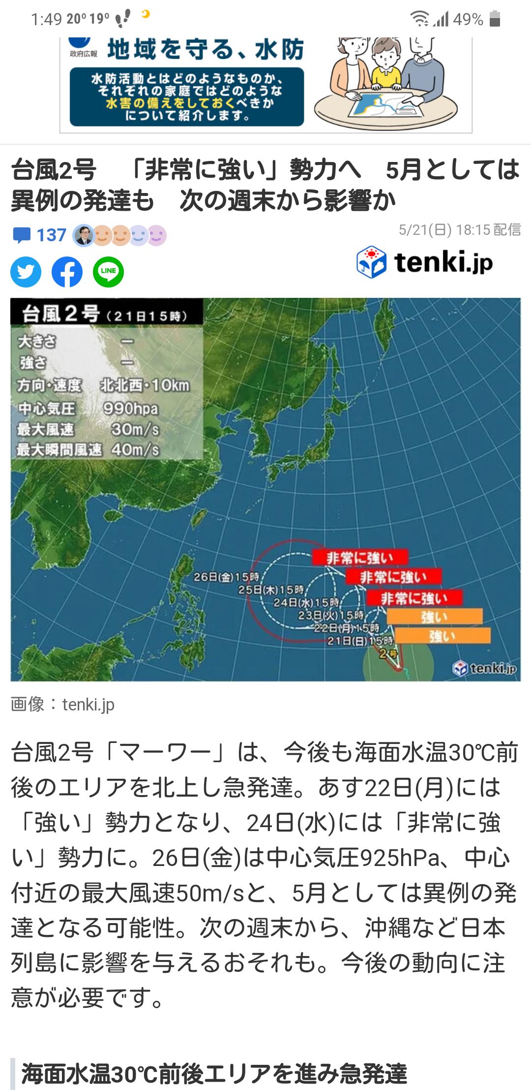 台風2号の勢力が非常に強いと聞いて、心配ですね。特に来週末からの影響が気になります。被害が出ないように、対策をしっかりと考えたいと思います。