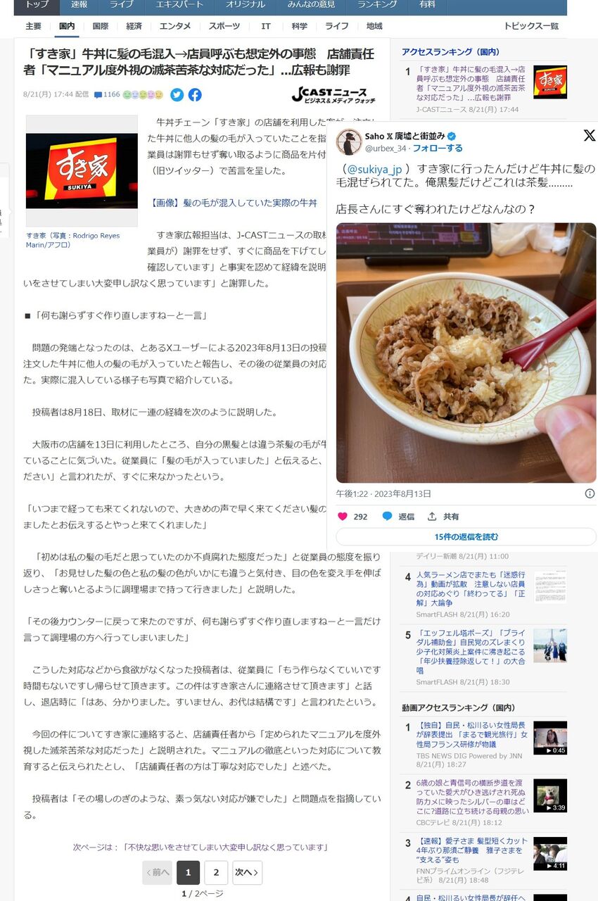 | 「すき家」牛丼に髪の毛混入→店員呼ぶも想定外の事態 店舗責任者 ... - Yahoo!ニュース 「すき家」牛丼に髪の毛混入→店員呼ぶも想定外の事態 店舗責任者 ... Yahoo!ニュース (出典:Yahoo!ニュース) |