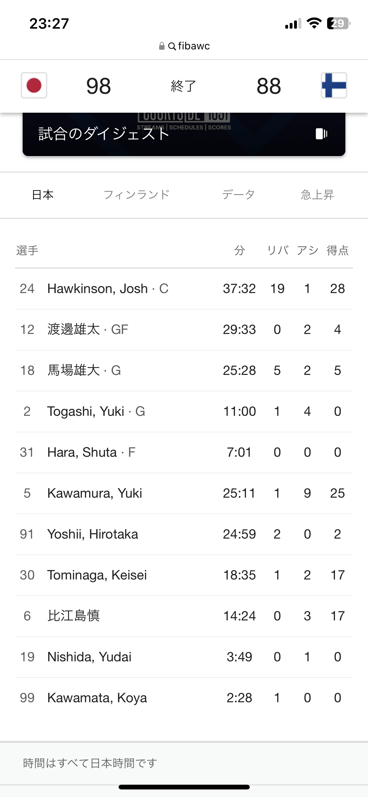 FIBAバスケットボールワールドカップ2023 1次ラウンド 日本×フィンランド★16