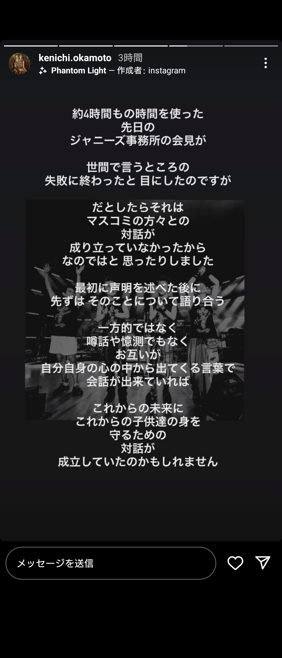 投稿では「ジャニーズのことなんてどうでもいい いつ何が起こるかわからないから 自分のこと 子供のこと 自分のまわりのこと 子供のまわりのこと 日本のこと 子供達のこと 世界の子供達のこと もう一度自分達のことを考え 今のこの時間を大切に使って行こうと思った」と発信した。