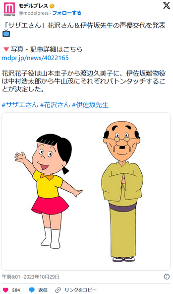 【モデルプレス=2023/10/29】フジテレビにて放送中の国民的人気アニメ『サザエさん』(毎週日曜18時30分~)の“花沢さん”こと花沢花子役の声優が山本圭子から渡辺久美子に、“伊佐坂先生”こと伊佐坂難物役の声優が中村浩太郎から牛山茂にそれぞれバトンタッチすることが決定した。