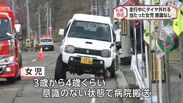 警察などによりますと、11月14日札幌市西区で、走行中の車両から外れたタイヤが女の子に直撃し、病院に搬送されました。