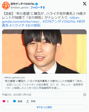 SNSでは《ハライチ岩井の結婚気持ち悪い=おばさんの若い女への嫉妬と捉えられるってマジ? どういう思考回路してたらそうなんの?笑》《ハライチ岩井の一件は若い女を捕まえた事に対するオヤジの嫉妬と若い女が選ばれる事に対するおばさんの嫉妬の戦争です》などと“論争”が巻き起こっている。