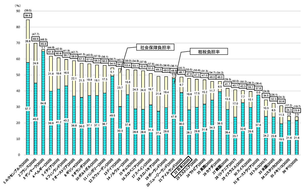 財務省作成の国民負担率の国際比較(OECD加盟36カ国2020年度)を見てみると、日本は36カ国中22位とそこまで高い順位ではありません。
