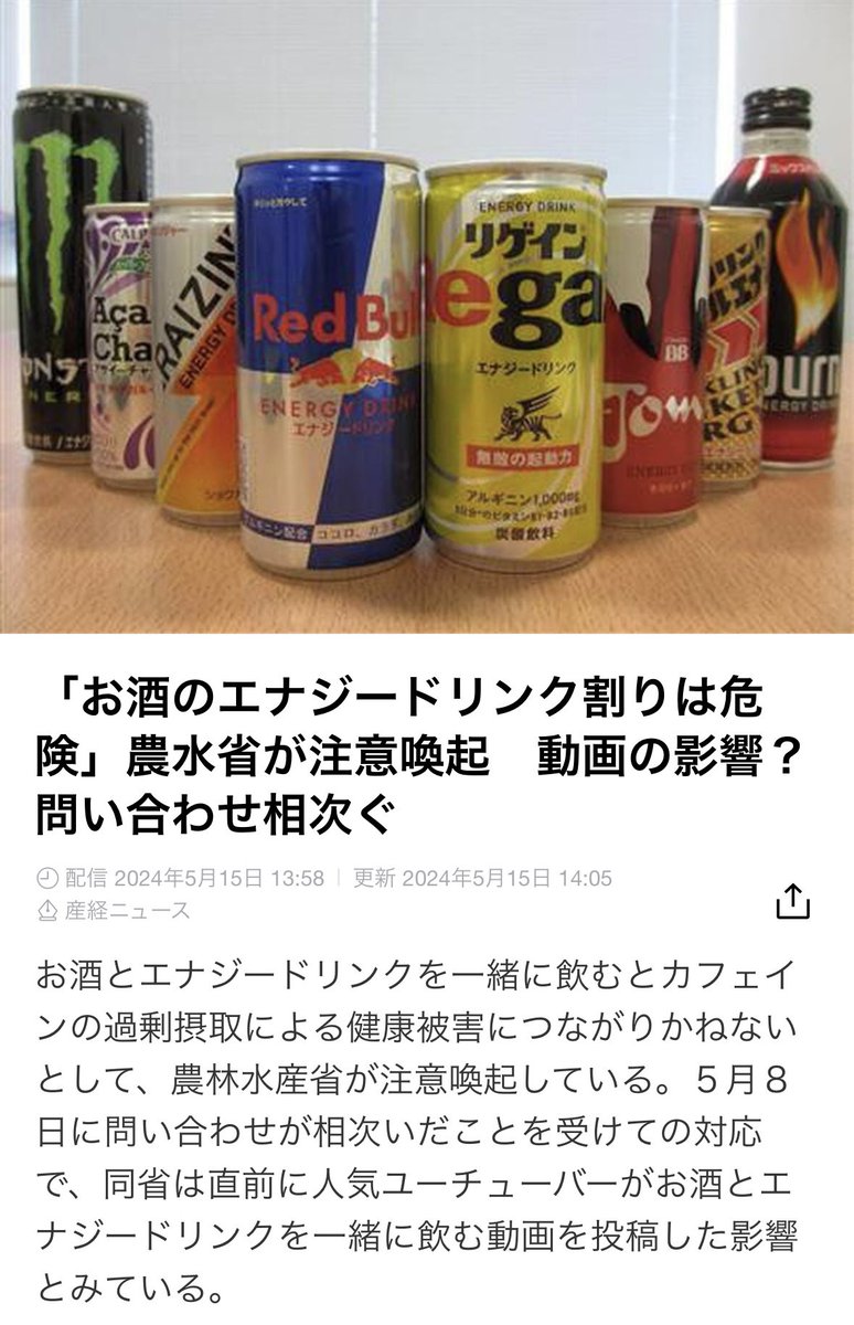 @Tz_akgt「お酒のエナジードリンク割りは危険」農水省が注意喚起 動画の影響?問い合わせ相次ぐ(産経新聞) news.yahoo.co.jp/articles/55a7d…