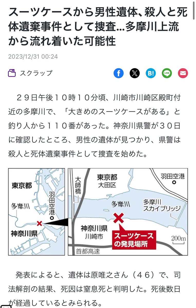 @Sankei_news死体遺棄容疑男女5人逮捕 多摩川スーツケース遺体 sankei.com/article/202405… スーツケースは昨年、遺棄したとみられる場所から約2キロ下流の川崎市川崎区殿町付近で釣り人が発見。原さんは死後数日程度で、手脚を折り曲げられていた。