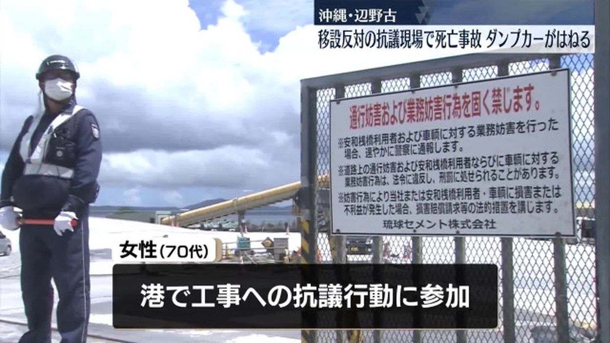 県警名護署によると、桟橋側から道路へ出ようとしていたダンプが、近くにいた警備員の男性と、抗議していた女性に衝突したという。