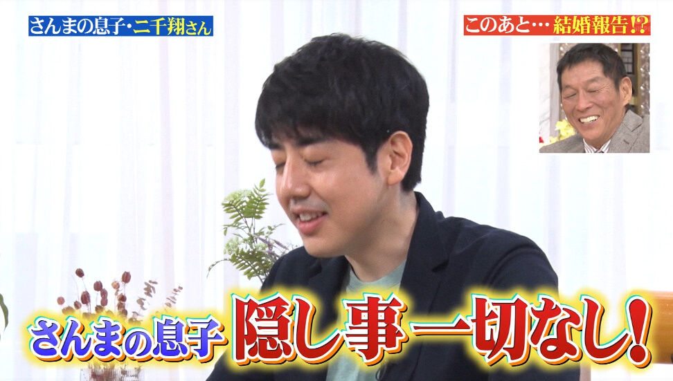 二千翔さんは現在、ウェブ制作会社を経営しており独身。過去には見かねたさんまが、ラジオ番組で長年共演した元「モーニング娘。」飯窪春菜とのお見合いをセッティングしたこともあったが、その後進展はなし。「(飯窪に)申し訳なくて…紹介に甘んじていたらダメだと反省いたしました」と自力で探す決意を固めていた。