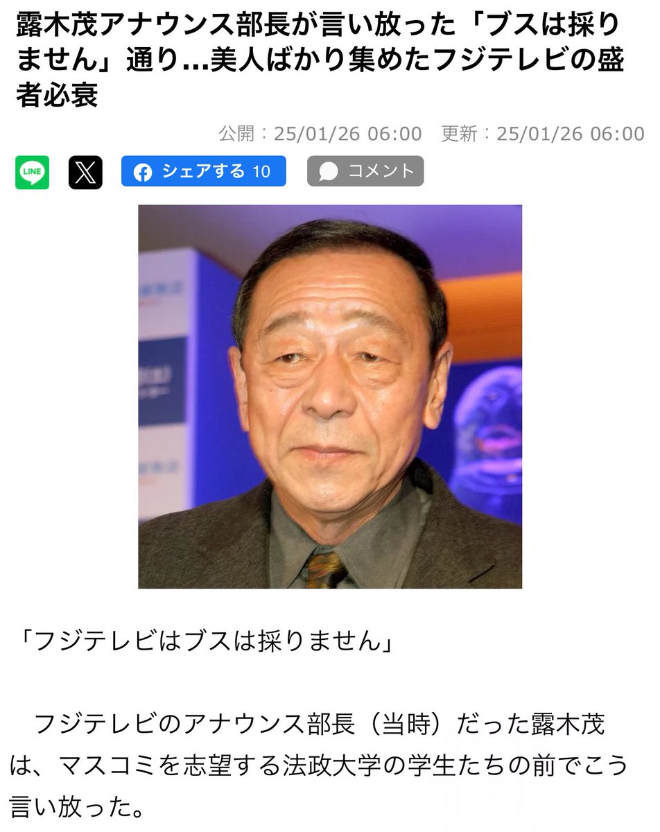 | 露木茂アナウンス部長が言い放った「ブスは採りません」通り…美人ばかり集めたフジテレビの盛者必衰(元木昌彦/「週刊現代」「フライデー」元編集長) …【週刊誌からみた「ニッポンの後退」】 「フジテレビはブスは採りません」 フジテレビのアナウンス部長(当時)だった露木茂は、マスコミを志望する法政大… (出典:) |