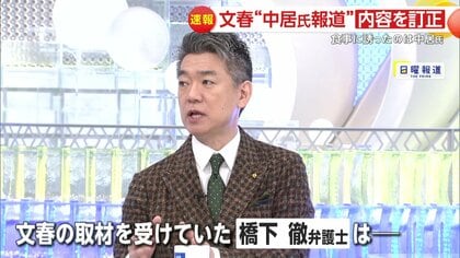 元大阪府知事の橋下徹氏が29日、カンテレ「旬感Live とれたてっ!」に出演。週刊文春が、中居正広さんの女性トラブルに関するフジテレビ社員が関与していたという報道の記事について、訂正とおわびをしたことについて言及した。
