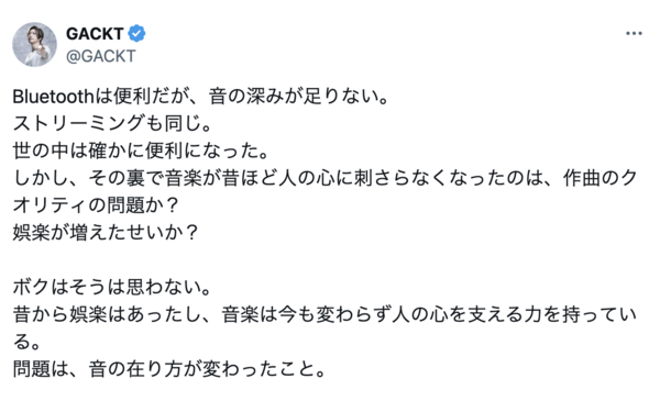 GACKTさんの言う通り、音楽体験は聴く環境によって大きく変わります。特に、良質なヘッドホンと有線接続がもたらす音の深さは、スマホやワイヤレスの音とはまったく別物です。皆さんも是非、時間をかけて音楽を楽しむことをおすすめします!