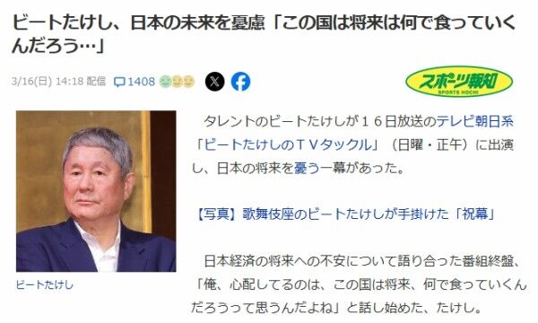 | ビートたけし、日本の未来を憂慮「この国は将来は何で食っていくんだろう…」 - dメニューニュース ビートたけし、日本の未来を憂慮「この国は将来は何で食っていくんだろう…」 dメニューニュース (出典:dメニューニュース) |