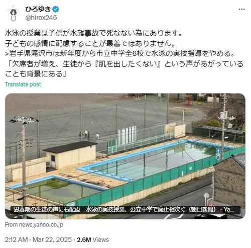 ひろゆき氏は、全国の公立中学校で水泳の実技授業をやめる動きが相次いでいるなどと報じた朝日新聞のネット記事を添付。同紙では熱中症リスク、プール老朽化のほか、肌の露出を避けたい思春期の生徒への配慮なども理由だなどという趣旨の事情も伝えている。