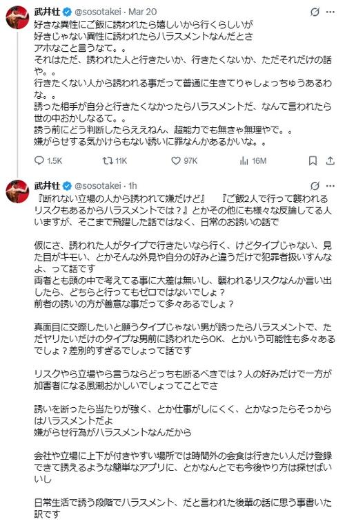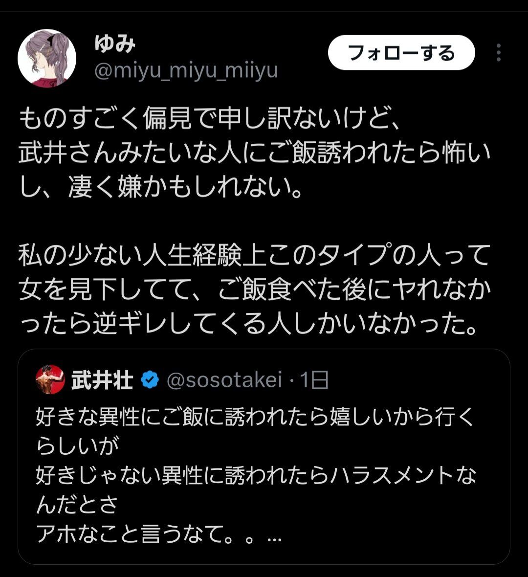 これに対し、女性とみられる一部Xユーザーが「ものすごく偏見で申し訳ないけど、武井さんみたいな人にご飯誘われたら怖いし、凄く嫌かもしれない。私の少ない人生経験上このタイプの人って女を見下してて、ご飯食べた後にヤれなかったら逆ギレしてくる人しかいなかった」と投稿した。