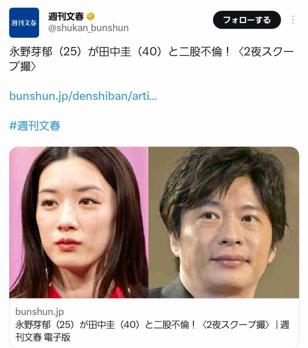 | 永野芽郁(25)が田中圭(40)と二股不倫!〈2夜スクープ撮〉【週刊文春 目次】 5月1・8日ゴールデンウィーク特大号 | 週刊文春 - 文春オンライン 永野芽郁(25)が田中圭(40)と二股不倫!〈2夜スクープ撮〉【週刊文春 目次】 5月1・8日ゴールデンウィーク特大号 | 週刊文春 文春オンライン (出典:文春オンライン) |