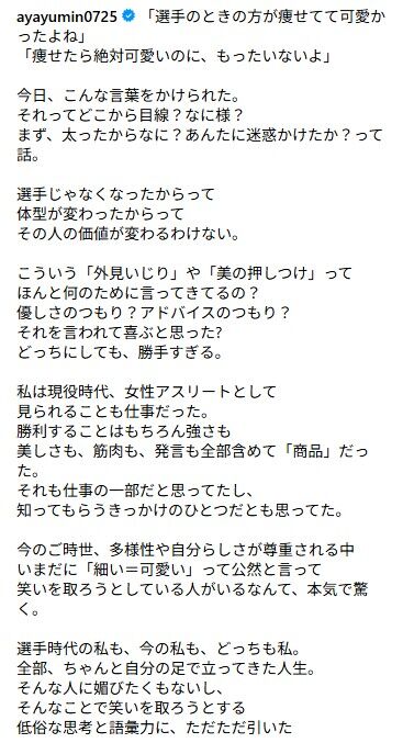 植草歩選手のコメントは、体型に対する過剰な批判に対して強い意志を示しています。誰しも自分自身を受け入れ、他者の意見に左右されることなく生きる権利があります。これからも自分を大切にする姿勢を持ち続けてほしいです。
