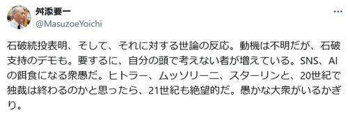 舛添氏は石破氏の去就について「今は参院選敗北の責任をとって辞任すべきである。新しい総裁の下で自民党を再生するしかない」との考えを示していたが、今回の投稿で「石破続投表明、そして、それに対する世論の反応。動機は不明だが、石破支持のデモも」と言及し、「要するに、自分の頭で考えない者が増えている。SNS、AIの餌食になる衆愚だ」とバッサリ。