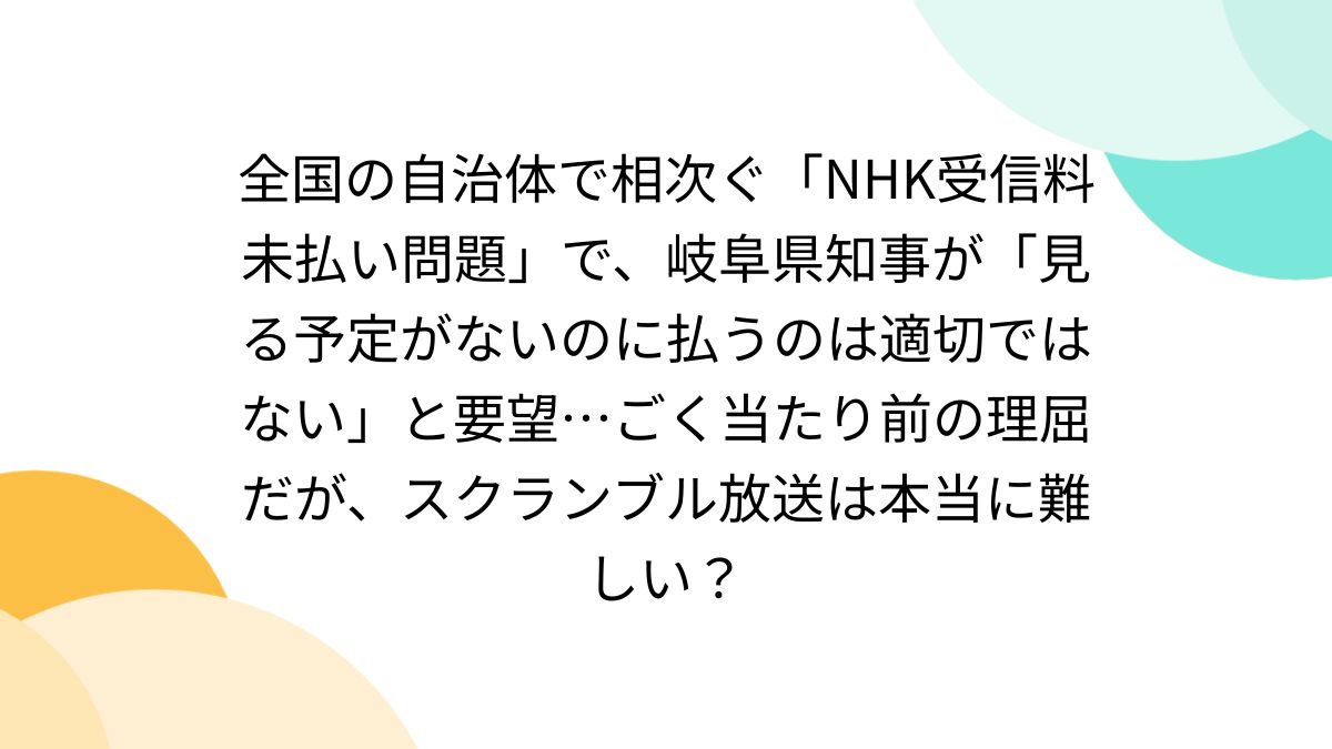 岐阜県知事の発言は、NHK受信料のあり方について再考を促す重要な指摘ですね。公用車のカーナビでの受信料未払い問題は、税金の使い道についても議論を呼ぶきっかけになりそうです。多くの人が同じように感じていると思いますが、「見る予定がないのに払う」というのは少し納得がいかない部分があります。今後、受信料の徴収方法やその使い道について、より透明性のある議論が進むことを期待したいです。