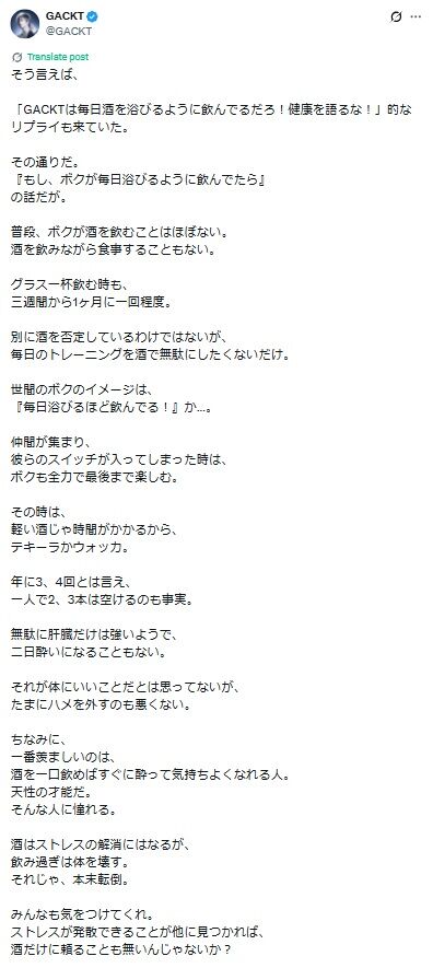 その流れで10日の投稿では「そう言えば、『GACKTは毎日酒を浴びるように飲んでるだろ!健康を語るな!』的なリプライも来ていた」と書き出した。