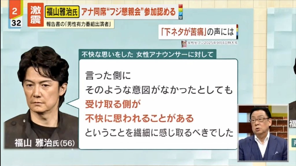 フジテレビ第三者委員会の報告書で「不適切な会合」と認定された懇親会に参加していた「男性有力番組出演者」が、ミュージシャン・俳優の福山雅治氏であることが8/18「女性セブン」が明らかにした。