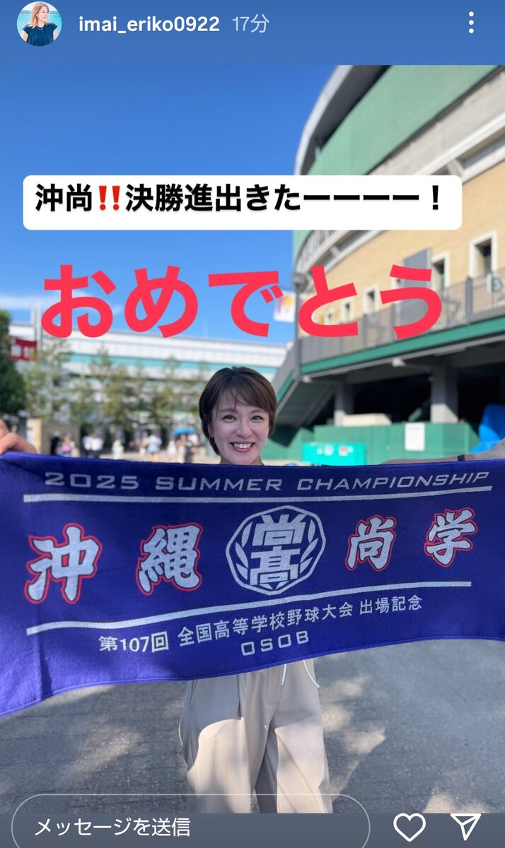 この結果に今井氏は、「2025 SUMMER CHAMPIONSHIP 沖縄尚学 『第107回全国高校野球選手権大会』出場記念 OSOB」と書かれた大判のタオルを掲げた自身の写真に「沖尚!!決勝進出きたーーーー!」「おめでとう」と文字を乗せ、投稿のハッシュタグとして、「#沖縄尚学」「#決勝進出」「#おめでとう」と添えた。