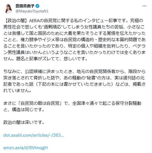豊田氏は「豊田真由子が見たセクハラ横行の自民党『年配の男性議員に手を握られ…』“過剰順応”する女性議員の現実」との見出しで配信された、自身のインタビュー記事を紹介。その記事内容について「究極の男性社会で悲しくも“過剰順応”してしまう女性議員たちの苦悩、小さなことは我慢して国と国民のために大義を果たそうとする覚悟を伝えたかったことと、権力闘争やイジメ等は自民党の構造的・歴史的な本質的問題であることを言いたかったのであり、特定の個人や組織を批判したり、ベテラン男性議員はいかんというようなことを言いたかったわけでは全くありません」と説明した上で、「題名と記事がズレてて、悲しいです」とつづった。