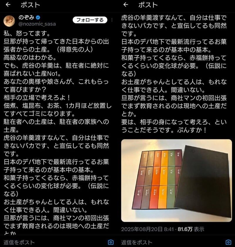「ポスト主はたまたま羊羹が好みではなかったのかもしれませんが、《駐在者に絶対に喜ばれない土産No1》と断定調の書きぶりが炎上を招いてしまったのでしょう。