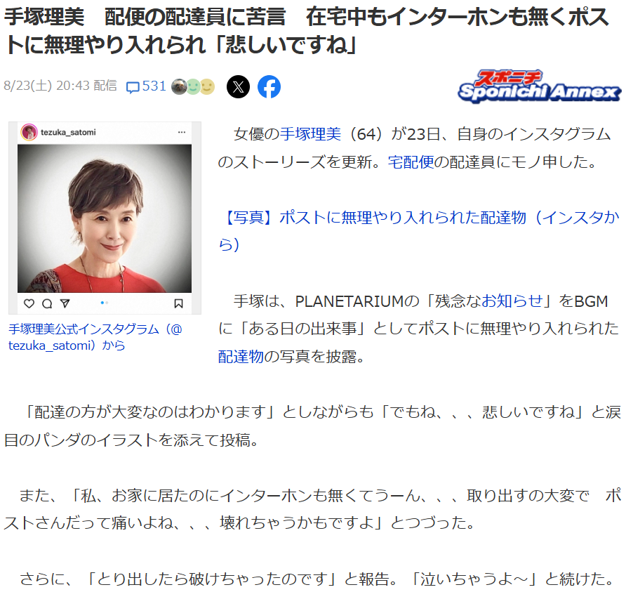 手塚理美 配便の配達員に苦言 在宅中もインターホンも無くポストに無理やり入れられ「悲しいですね」