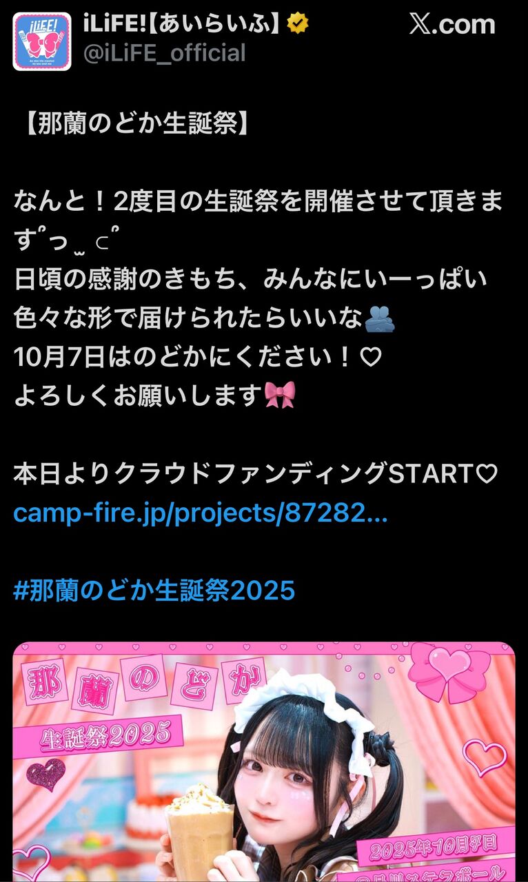 「平素よりiLiFE!を応援いただき誠にありがとうございます。 この度メンバーの『那蘭のどか』におきまして、重大な規約違反が判明いたしました。」として「8月27日の日本武道館公演につきましては、メンバーとも協議を重ね、那蘭を含む9人にて出演させていただきます。那蘭はこの日を以て脱退とし、以降の活動はメンバー8名にて予定通り進めてまいります。」と報告。