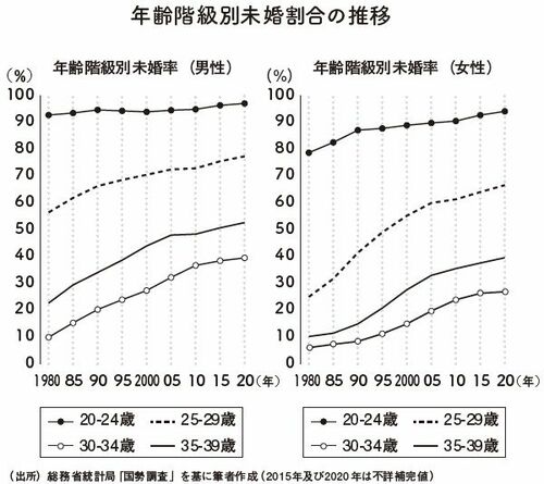 そんな批判が目に見えて増えたのが、14?15年ごろ。20代の未婚率が、男女で8割前後(男性85.0%、女性77.5%)にのぼったころからです(総務省「国勢調査」)。