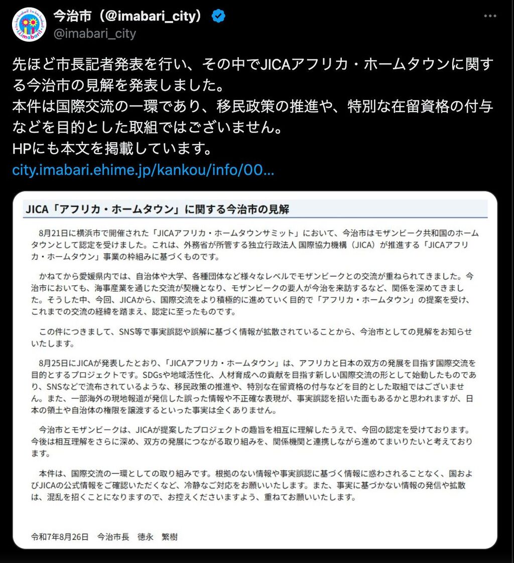 これは、8月20~22日に横浜で開催された「第9回アフリカ開発会議(TICAD9)」にて、国際協力機構(JICA)が交流促進の施策として国内4市(山形県長井市、千葉県木更津市、新潟県三条市、愛媛県今治市)をアフリカ諸国の「ホームタウン」に認定したことに端を発する。