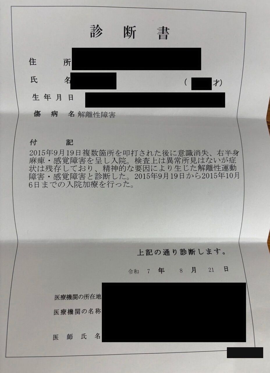 〈2015年9月19日複数箇所を叩打された後に意識消失、右半身麻痺・感覚障害を呈し入院。検査上は異常所見はないが症状は残存しており、精神的な要因により生じた解離性運動障害・感覚障害と診断した。2015年9月19日から2015年10月6日までの入院加療を行った〉