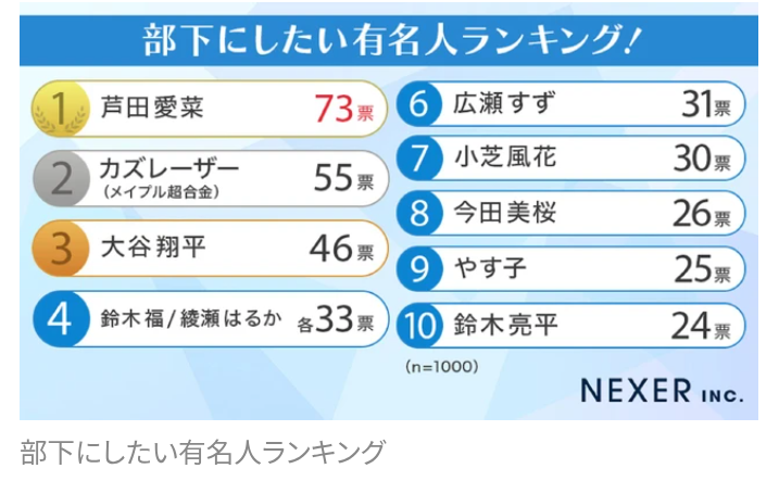 インターネットリサーチの株式会社NEXERはこのほど、講演会講師派遣サイト「スピーカーズ」と共同で、全国の男女1000人を対象に「部下にしたい有名人」についてのアンケートを実施、ランキング結果を公表した。