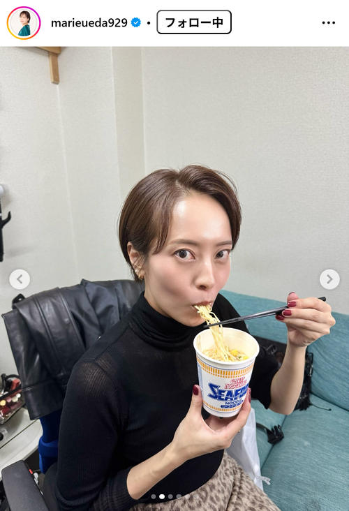フリーアナウンサーの上田まりえ(39)が14日、自身のインスタグラムを更新。11日に大阪市内で開催された自身のイベント内で、人生で初めてカップラーメンを食べたことを報告した。