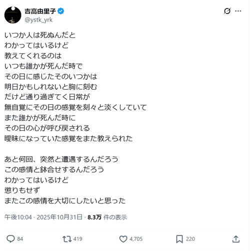 吉高由里子さんがX(旧ツイッター)で「人の死」について思いを投稿したよ。