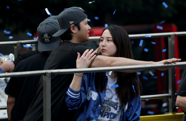 同パレードには大谷妻の真美子さんも参加。大谷の背番号が入ったドジャーブルーのスタジャンに優勝記念Tシャツを着用し、ファンからの祝福に応えていた。