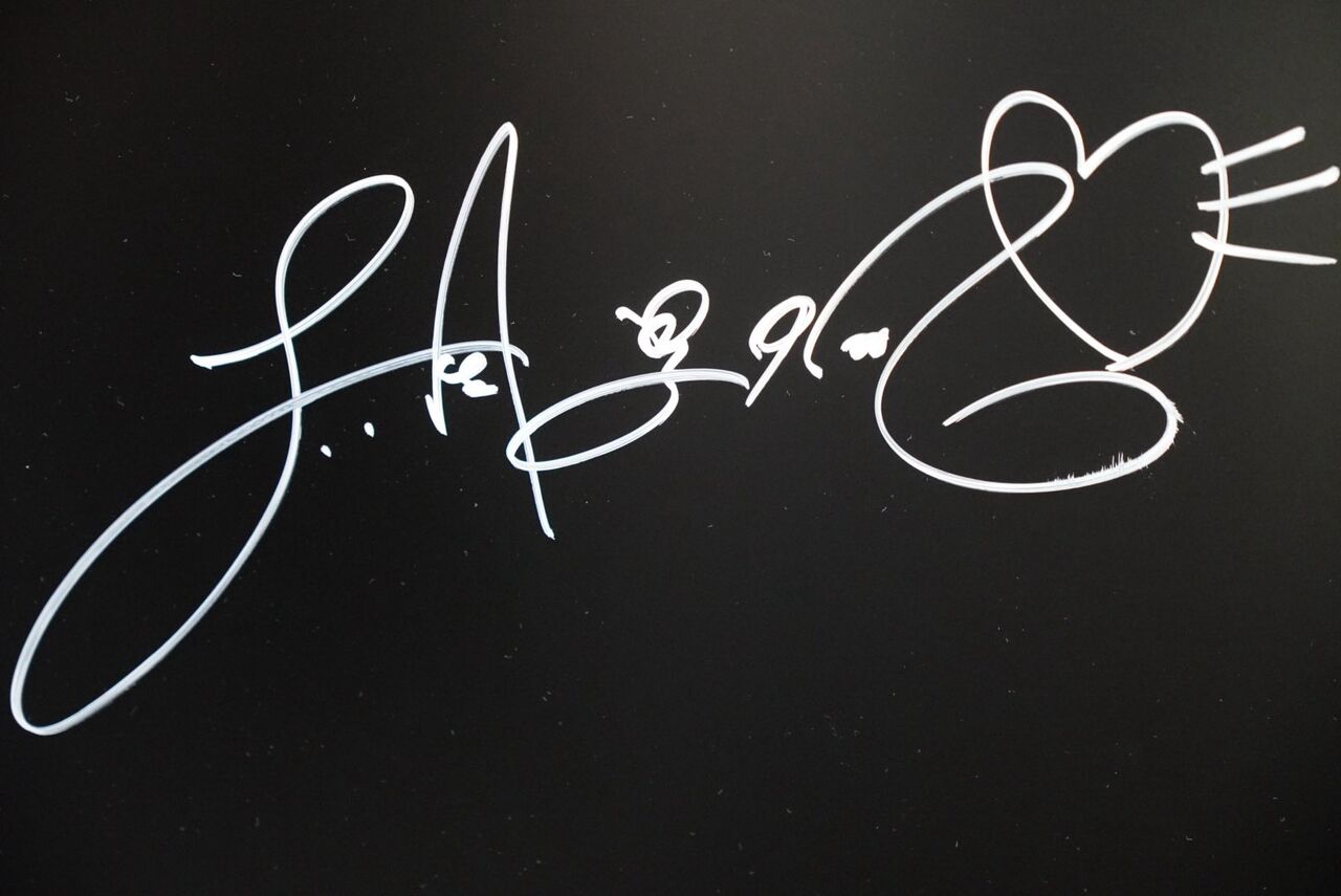 その他にも、ボードにペンを走らせる吉岡さんの横顔をとらえた写真と完成したサインのアップショットを披露しています。