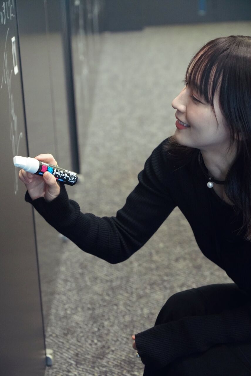 1枚目には*のワンピースを着た吉岡さんが、黒いボードの前にしゃがんだ姿が写っています。手に白インクのマーカーペンを持ち、カメラにほほ笑みかける様子がとってもキュートですね……!