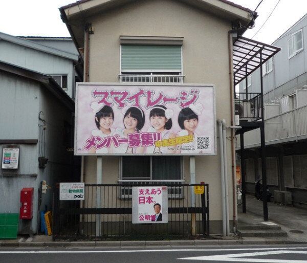 ●*学会員の住居にスマイレージ新メンバー募集の看板(下に公明党のポスター)