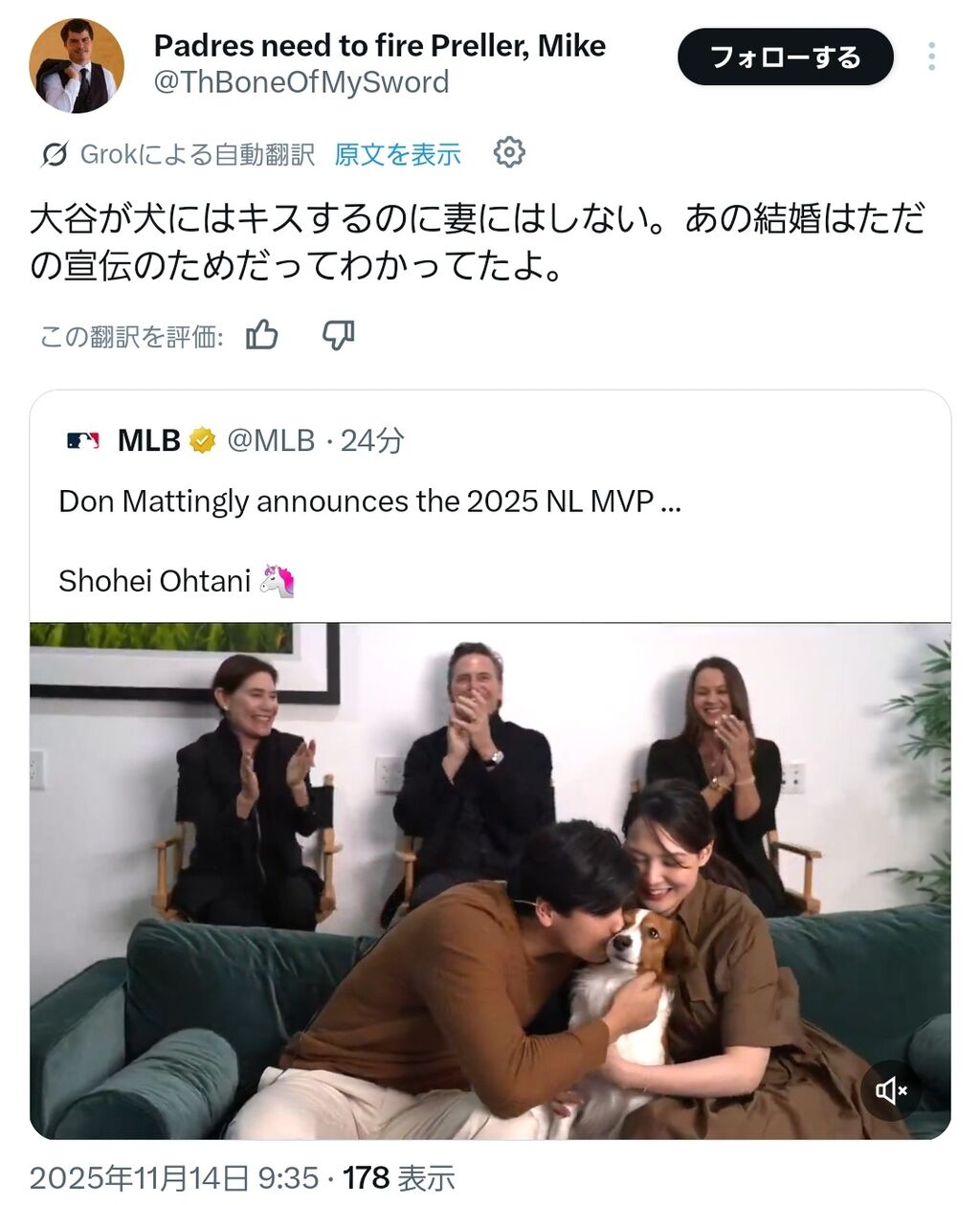 昨年に続き、MVP発表の瞬間は、妻の真美子さん(28)と愛犬デコピンも一緒だった。MLB専門チャンネル「MLBネットワーク」の生中継に出演した大谷は、MVPが発表されると、隣に座る真美子さんとデコピンをハグし、デコピンにはキスまでしていた。