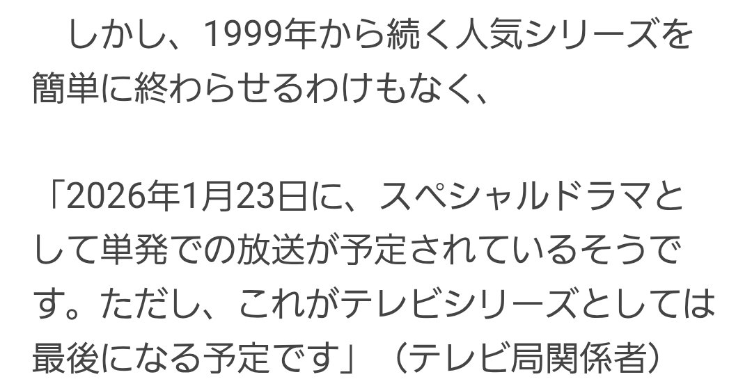 しかし、1999年から続く人気シリーズを簡単に終わらせるわけもなく、 「2026年1月23日に、スペシャルドラマとして単発での放送が予定されているそうです。ただし、これがテレビシリーズとしては最後になる予定です」(テレビ局関係者)
