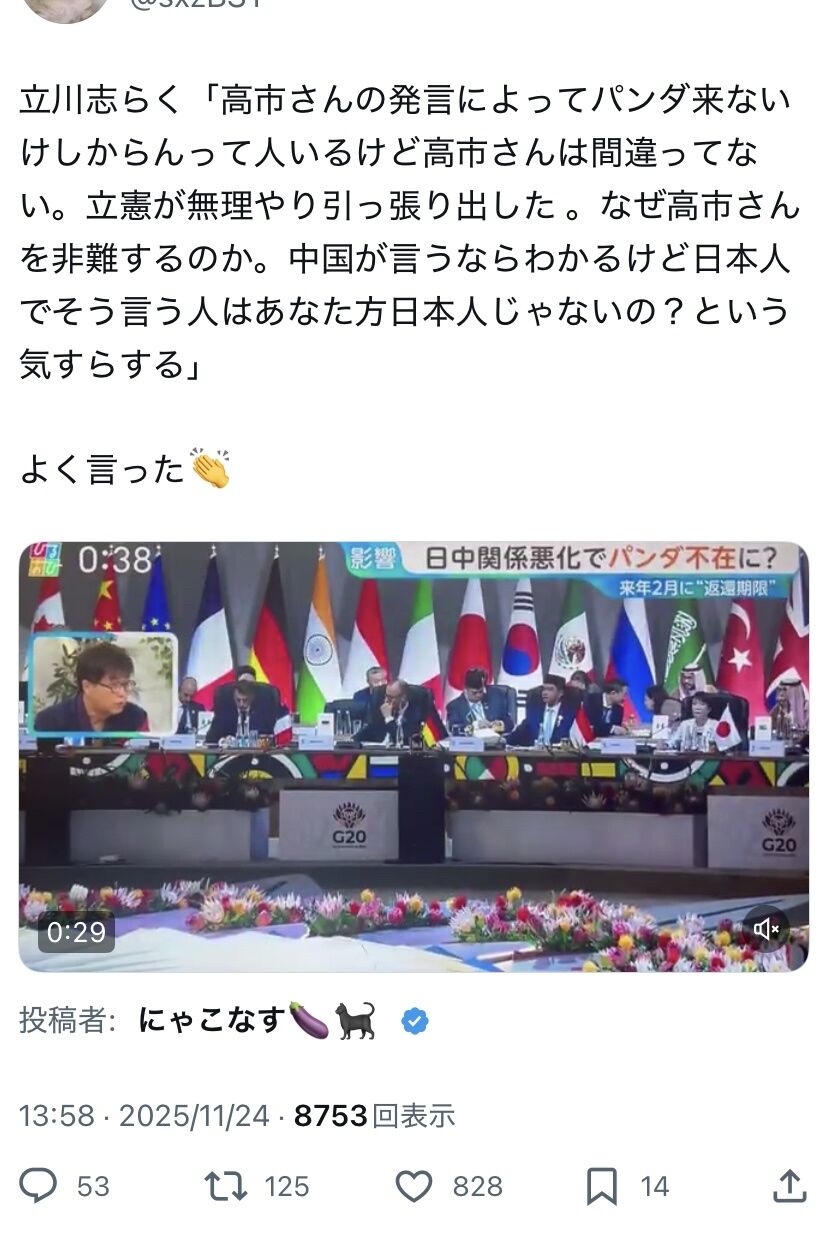 番組では、中国メディアが日本への渡航についてすでに54万件以上のキャンセルが出たことや、日本へのパンダ貸与を停止する可能性について報じたことなどを紹介した。
