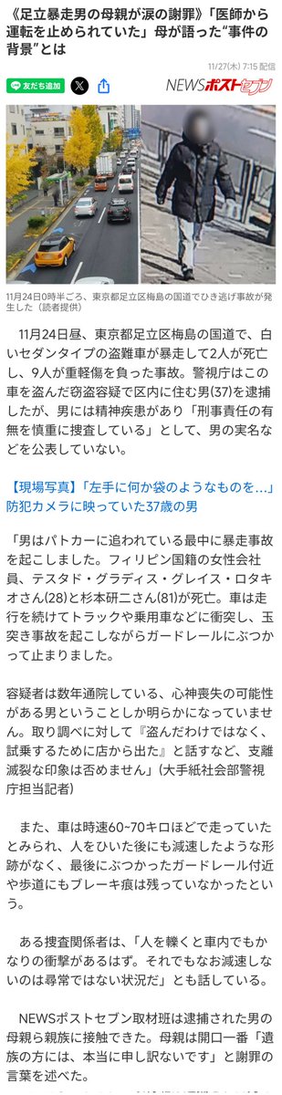 足立暴走事故の背景には、数年前から統合失調症を患う男の精神疾患と薬の変更が影響とされる。母親は謝罪し、男は医師から運転禁止を受けていたが、盗車を試乗目的で使用。