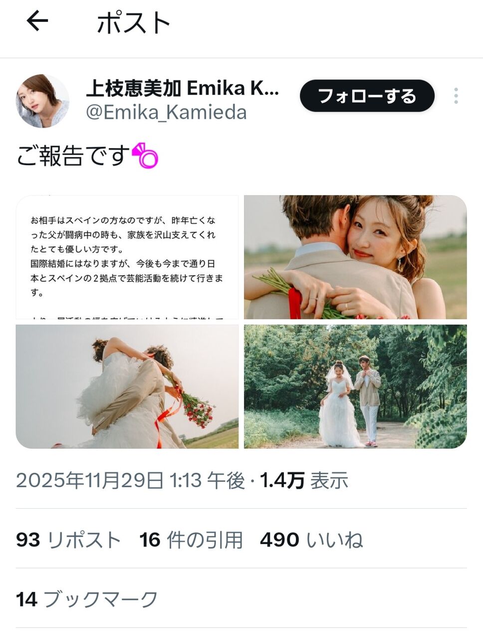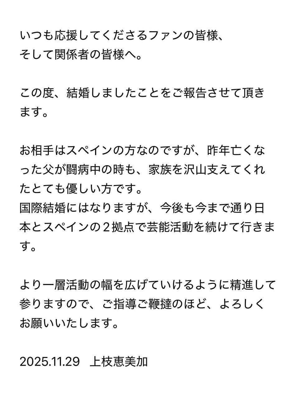 おめでとう、上枝さん! スペインの情熱と日本の優しさが融合した素敵な国際結婚。家族を支える優しいパートナーに出会えて、心から嬉しいニュースです。これからも輝く活躍を日本とスペインから応援してます♡
