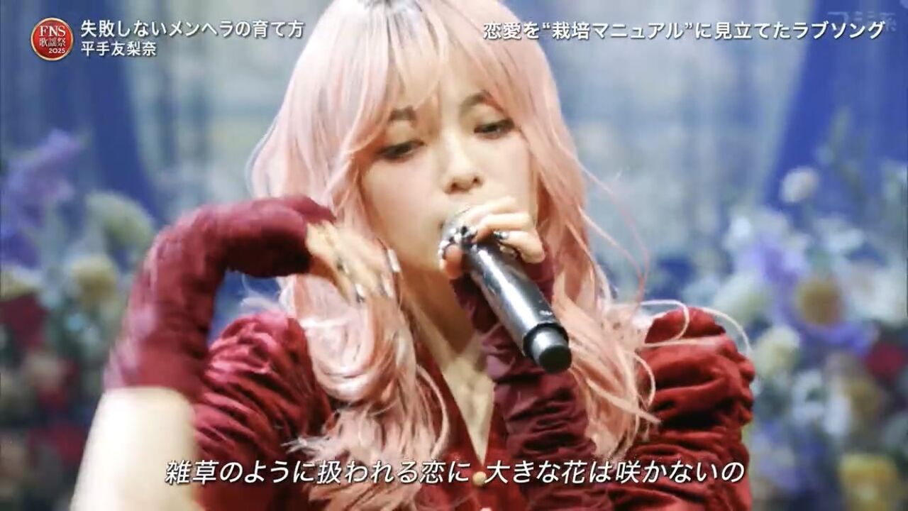 平手は自身の新曲「失敗しないメンヘラの育て方」を、ピンク色のロングヘアに赤いドレス姿で軽快に踊りながら歌唱。