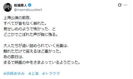 「エイベックス」の松浦勝人会長(61)が1日に自身のX(旧ツイッター)を更新。歌手・浜崎あゆみ(47)の中国・上海公演が中止となった件について言及した。